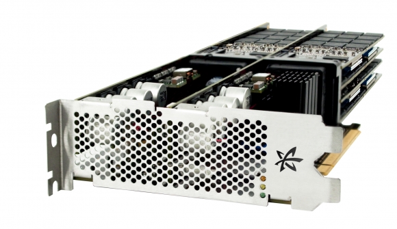 PCIe cards also come in multiple widths. Such a configuration allows mating with adjacent motherboard connectors, enabling increased performance by supporting more than 16 PCIe lanes. Below is an example of a double-width PCIe card.