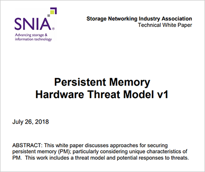 - The Persistent Memory Hardware Threat Model White Paper discusses approaches for securing persistent memory (PM); particularly considering unique characteristics of PM. This work incldues a threat model and potential responses to